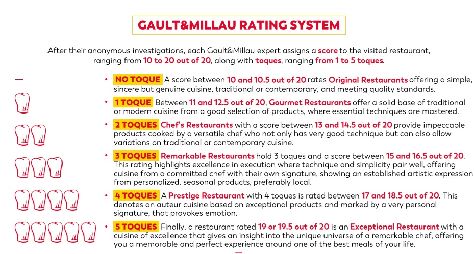 Gault&Millau evaluates restaurants on a 20-point scale, awarding one to five toques to the highest-rated establishments. The evaluation focuses entirely on what happens on the plate: the quality of ingredients, the precision of techniques, coherence of flavors, and the chef’s own identity.