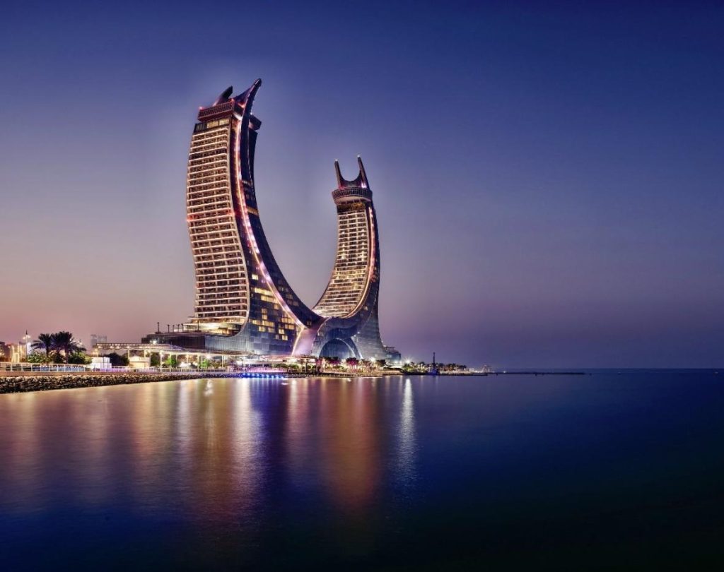 Rising above the Lusail Marina, Katara Towers is one of Qatar’s most distinctive landmarks. Its twin arcs mirror the nation’s crossed-sword emblem, blending symbolism and engineering in perfect balance. Inside, two worlds unfold: Raffles Doha, refined, residential luxury and Fairmont Doha, bold, contemporary flair. With its sculptural curves, reflective façades, and skyline presence, Katara Towers turns cultural pride into architectural poetry.